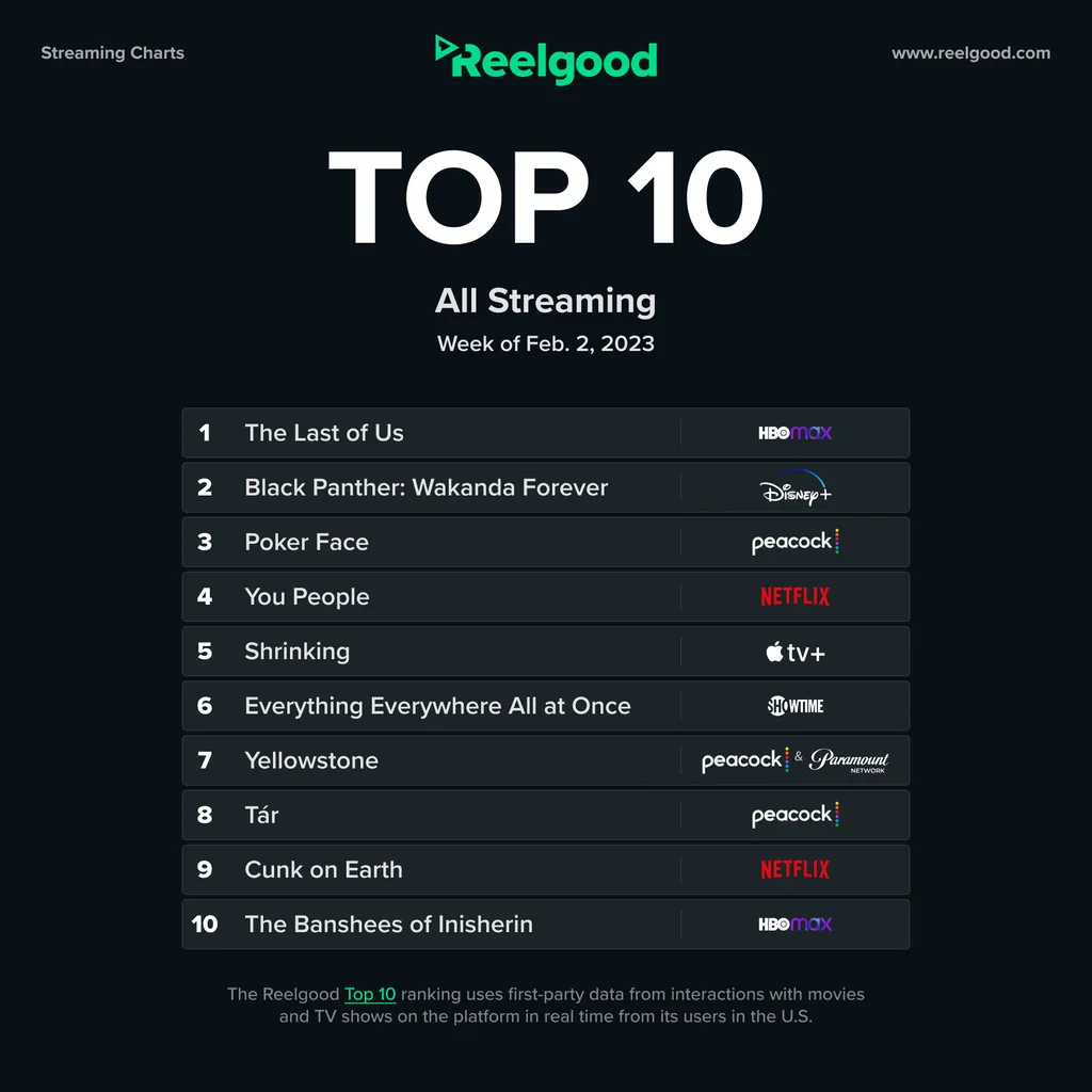 Reelgood のストリーミング分析では、2 月 2 日の週に最も人気があったストリーミング番組/映画の最新データが強調表示されます。
