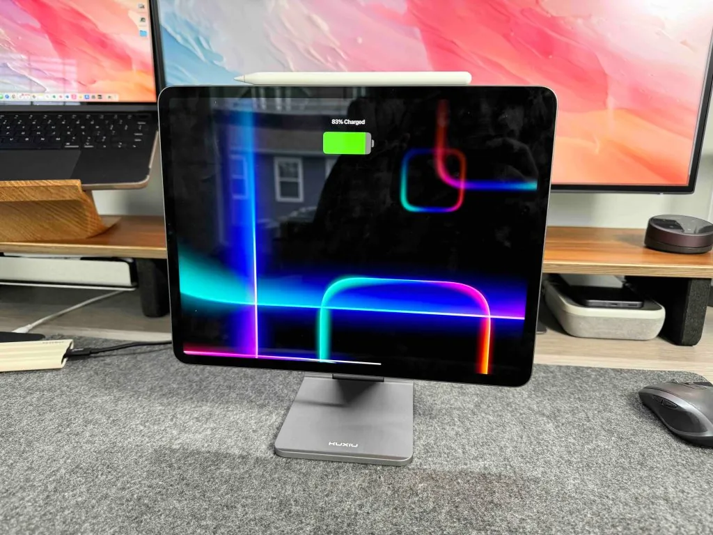 これは私のお気に入りのiPadアクセサリーです。昨年発売されて以来、私のデスクワークの必需品となっています。一見すると、iPad用のマグネット式スタンドとしてよくできているように見えますが、実は他の製品とは一線を画す大きな工夫が隠されています。マグネットプレートにピンコネクタを追加することで、パススルー充電を可能にしているのです!つまり、スタンドがiPadのワイヤレス充電スタンドに早変わりするのです!