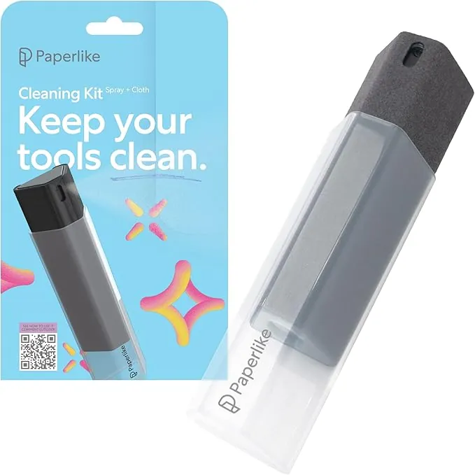最後に、あの大きな美しい画面を清潔に保ちましょう。Paperlikeのオールインワンクリーニングキットはまさにこれにぴったりです。スプレーボトルとクリーニングクロスが一体化しているので、クロスをなくす心配もありません!保護ケースからボトルを取り出し、画面に数回スプレーして、ボトルのマイクロファイバーの裏地で拭き取るだけです!とても簡単です。iPadをお持ちの方へのプレゼントに最適です!